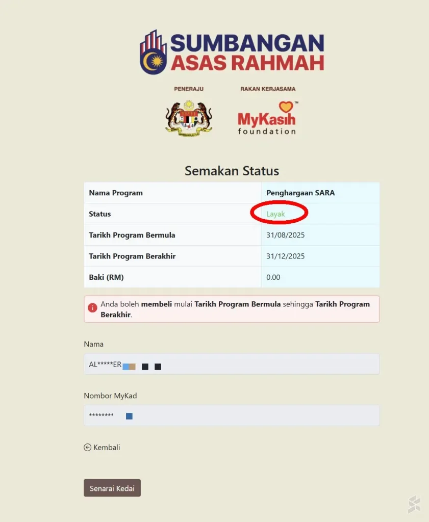 - Kalau keluar paparan “Layak”, tahniah! Anda memang layak terima bantuan RM100 ni