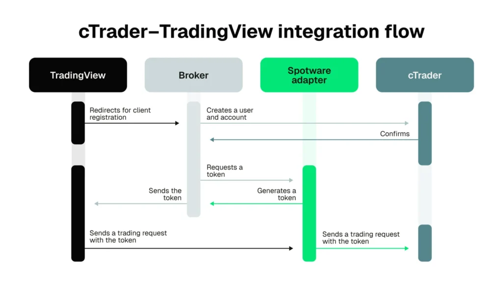 Integrasi ini diaktifkan melalui penyesuai khusus yang dibangunkan secara eksklusif oleh Spotware, memastikan pautan yang stabil antara antara muka TradingView dan sistem bahagian belakang cTrader. Broker boleh menambah antara muka dagangan tambahan dengan lancar tanpa mengubah infrastruktur sedia ada mereka. Spotware mengendalikan penempatan dan konfigurasi penyesuai, membolehkan pesanan yang dimulakan dalam TradingView diproses oleh sistem bahagian belakang cTrader, menggunakan persediaan, kawalan risiko dan sambungan broker yang sedia ada.