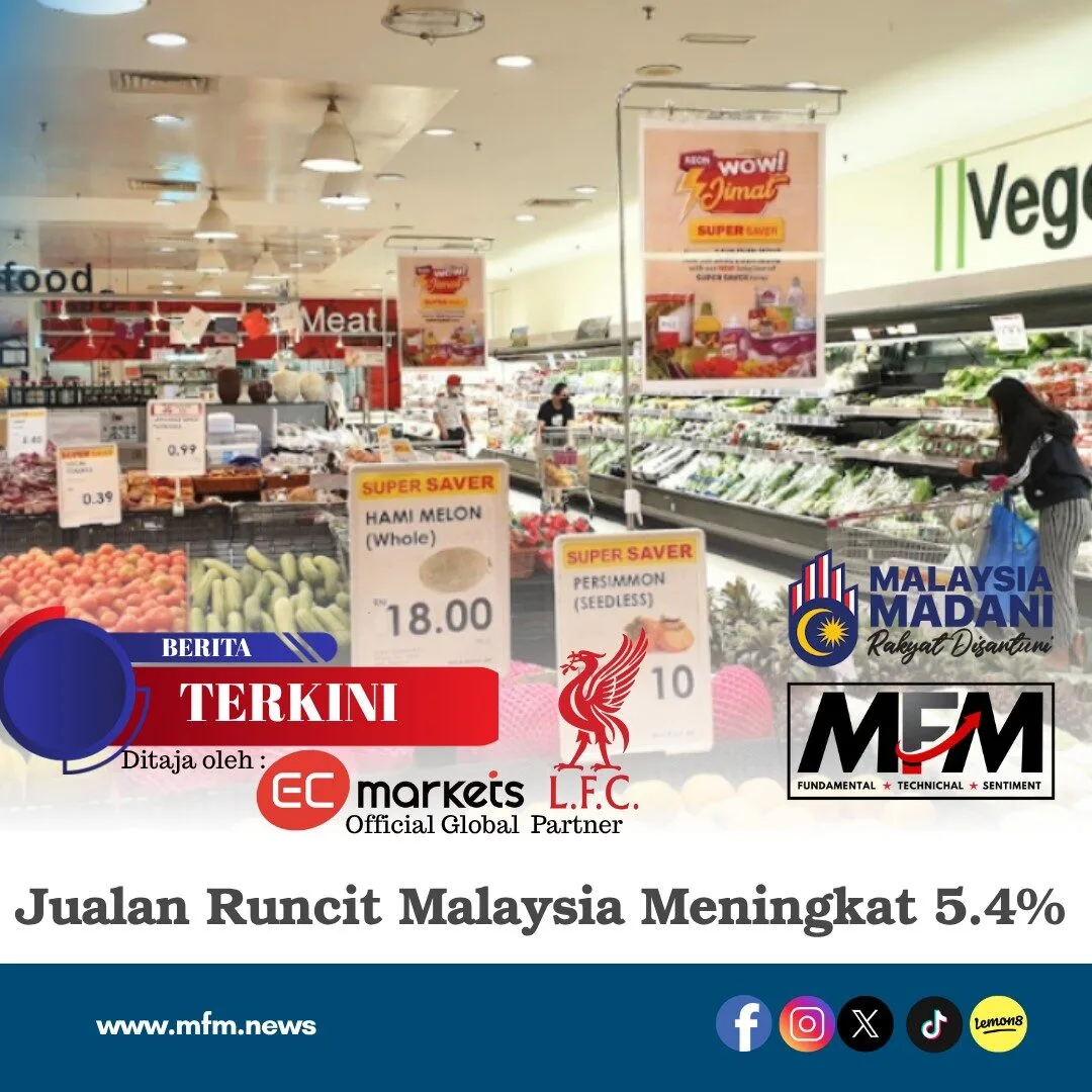 Jualan runcit di Malaysia meningkat sebanyak 5.4% tahun ke tahun pada Jun 2025, meningkat daripada peningkatan 4.9% pada bulan sebelumnya.