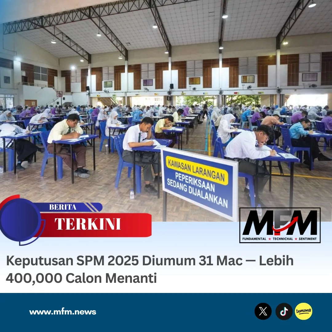 Keputusan Sijil Pelajaran Malaysia (SPM) 2025 dijadualkan akan diumumkan pada 31 Mac 2026, melibatkan lebih 400,000 calon di seluruh negara. Pengumuman ini pastinya dinanti-nantikan oleh pelajar, ibu bapa serta warga pendidik yang menunggu hasil usaha sepanjang tempoh pembelajaran.