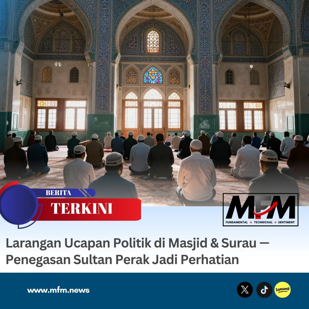 Ketetapan mengenai larangan ucapan politik di masjid dan surau kembali menjadi perbincangan apabila Sultan Perak menegaskan pendirian baginda berhubung perkara tersebut. Penegasan ini mencerminkan prinsip penting dalam memelihara kesucian institusi keagamaan agar kekal sebagai tempat ibadah, perpaduan dan ketenangan masyarakat.