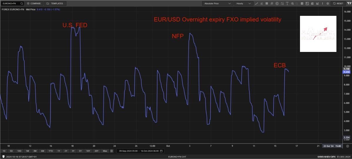 Pilihan semalaman tamat tempoh pada hari bekerja berikutnya pada 10 pagi New York/3 petang London dan oleh itu kini termasuk pengumuman dasar ECB. Kemeruapan tersirat mengukur jangkaan kemeruapan sebenar untuk menentukan premium dan kenaikan hari Rabu untuk tamat tempoh semalaman menandakan risiko turun naik yang direalisasikan tambahan untuk acara ini.