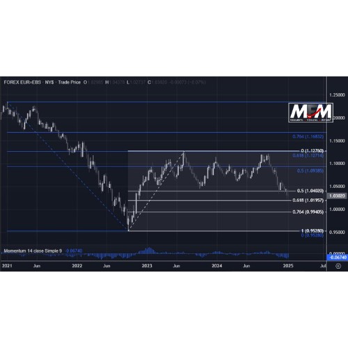 Jika EUR/USD terjun di bawah paras Fibonacci 1.0196, jejak semula 61.8% daripada kenaikan EBS 0.9528 kepada 1.1276 (2022-2023), itu akan mendedahkan 1.0000. Terutamanya apabila bacaan momentum negatif empat belas minggu berterusan menunjukkan kerugian yang lebih besar.
