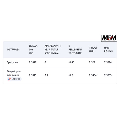 Spot yuanUSDCNYdibuka pada 7.3270 setiap dolar dan didagangkan pada 7.3317 menjelang tengah hari, 5 pip lebih kukuh daripada penutupan sesi lewat sebelumnya dan 1.98% lebih lemah daripada titik tengah.